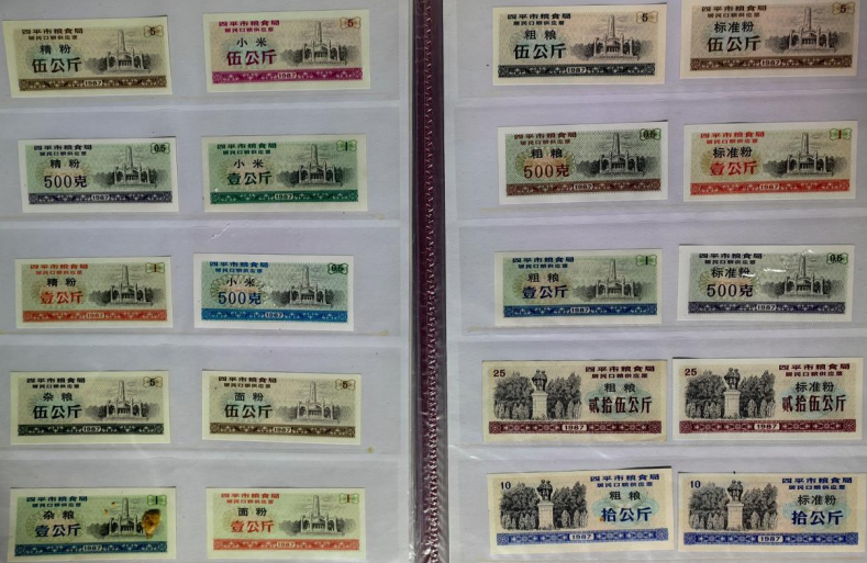 这张照片中的粮票主要是四平市粮食局印制的,有米面、粗粮、杂粮、精粉、标准粉等粮票,是1987年之后在当地流通使用的。