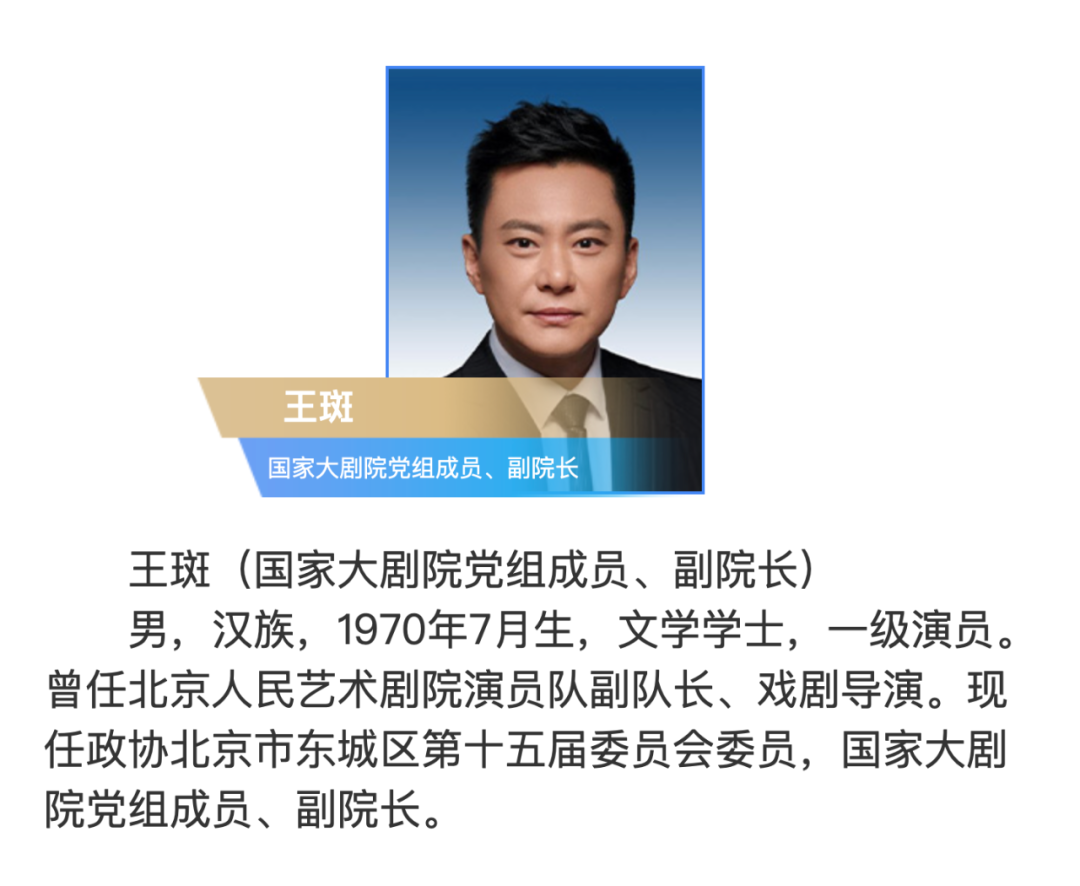 公开资料显示,王斑出生于1970年7月,毕业于中央戏剧学院表演系,文学学士,一级演员,现任政协北京市东城区第十五届委员会委员,国家大剧院党组成员、副院长。