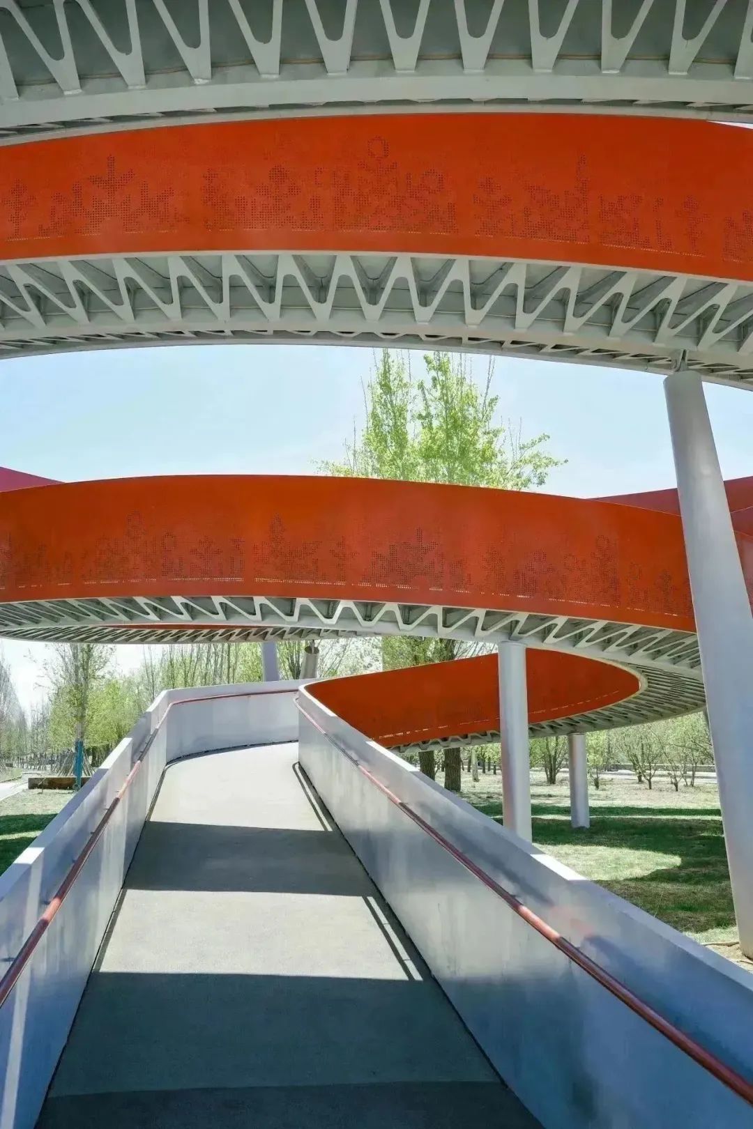 冬奥之环的钢材阶梯如缎带般环绕而下,以中国红着色,并点缀着镂空雪花,诠释出别样的刚与柔。