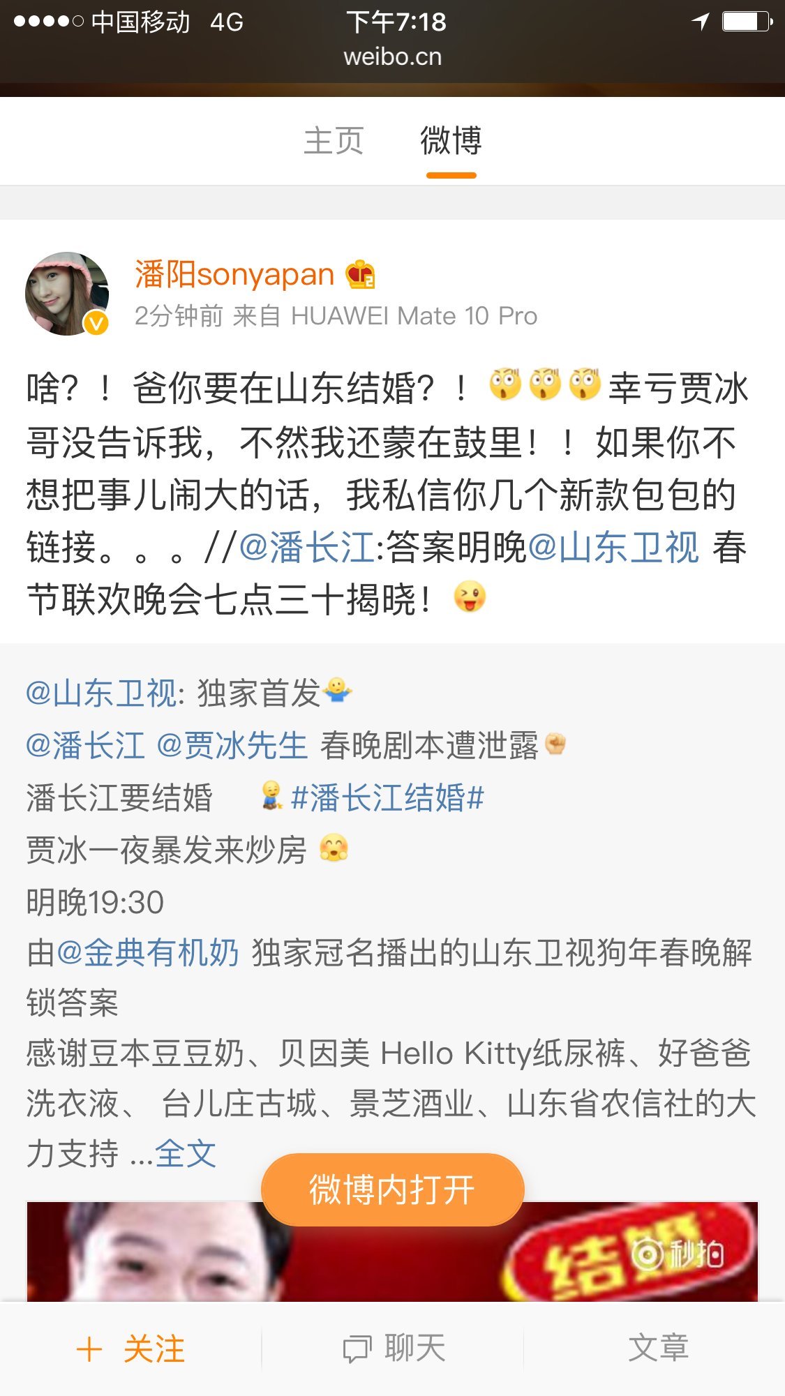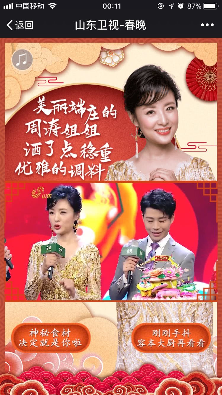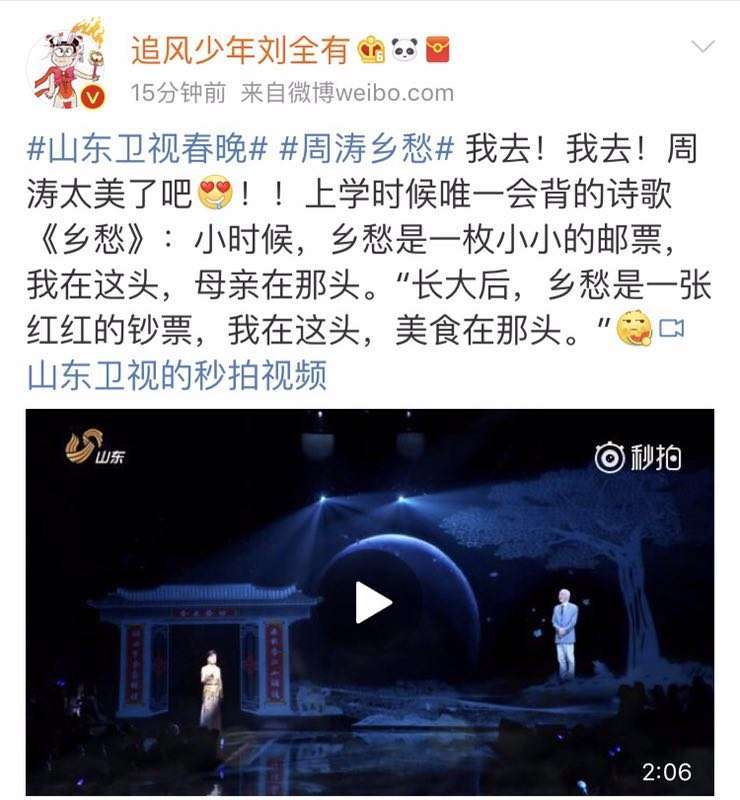 除了晚会中的“乡愁”特别节目设计外,山东卫视的宣传推广团队还围绕“大乡愁”进行了一系列宣推策划,#春运催泪MV#爆款传播,@人民日报、@环球时报、@人民网等百家主流媒体微博大号纷纷转发,点击量超过千万次;“鸡年最后一碗鸡汤”“潘长江贾冰春晚剧本泄露”等互动h5策划刷屏朋友圈;当晚新浪微博#山东卫视春晚#话题热度居高不下,@舞美师@卫视大揭秘@追风少年刘全有等微博大号纷纷为春晚发声,目前话题阅读量当晚即增长至8.1亿,“山东春晚”昨晚更是登上微博热搜榜。全面多样的宣推手段彰显了节目制作之外,雄厚的宣推实力和创新思路。