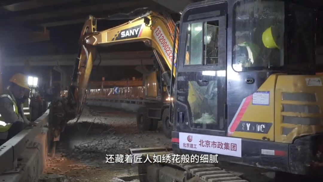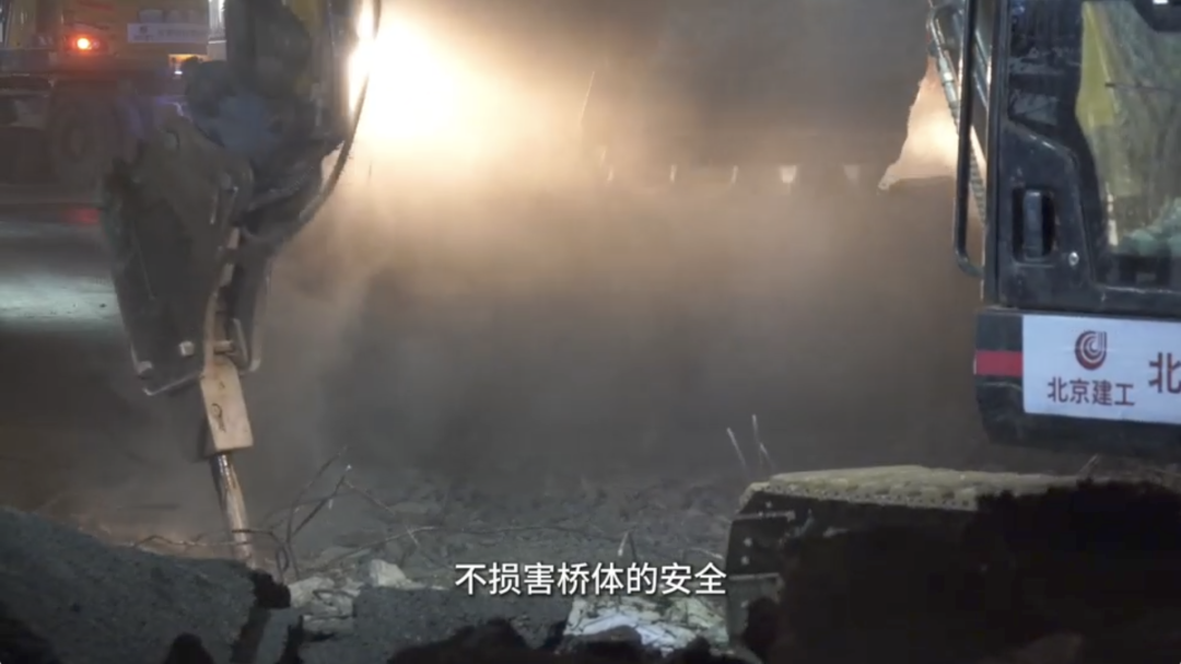 北京建工市政集团一公司总经理田延华说:“我们是用60的破碎炮,因为这个设备有最大输出力值。这个桥也属于33年老桥了,我们在选用设备的时候,就选用比较轻型的破除装备。在桥面破除过程中,桥梁主跨下挠为1.9毫米,对这么大桥梁来说基本可以忽略不计。”
