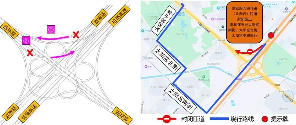 绕行措施:车辆沿京密路往南→太阳宫南街→太阳宫北街→太阳宫中路→四环路外环(4.5km)