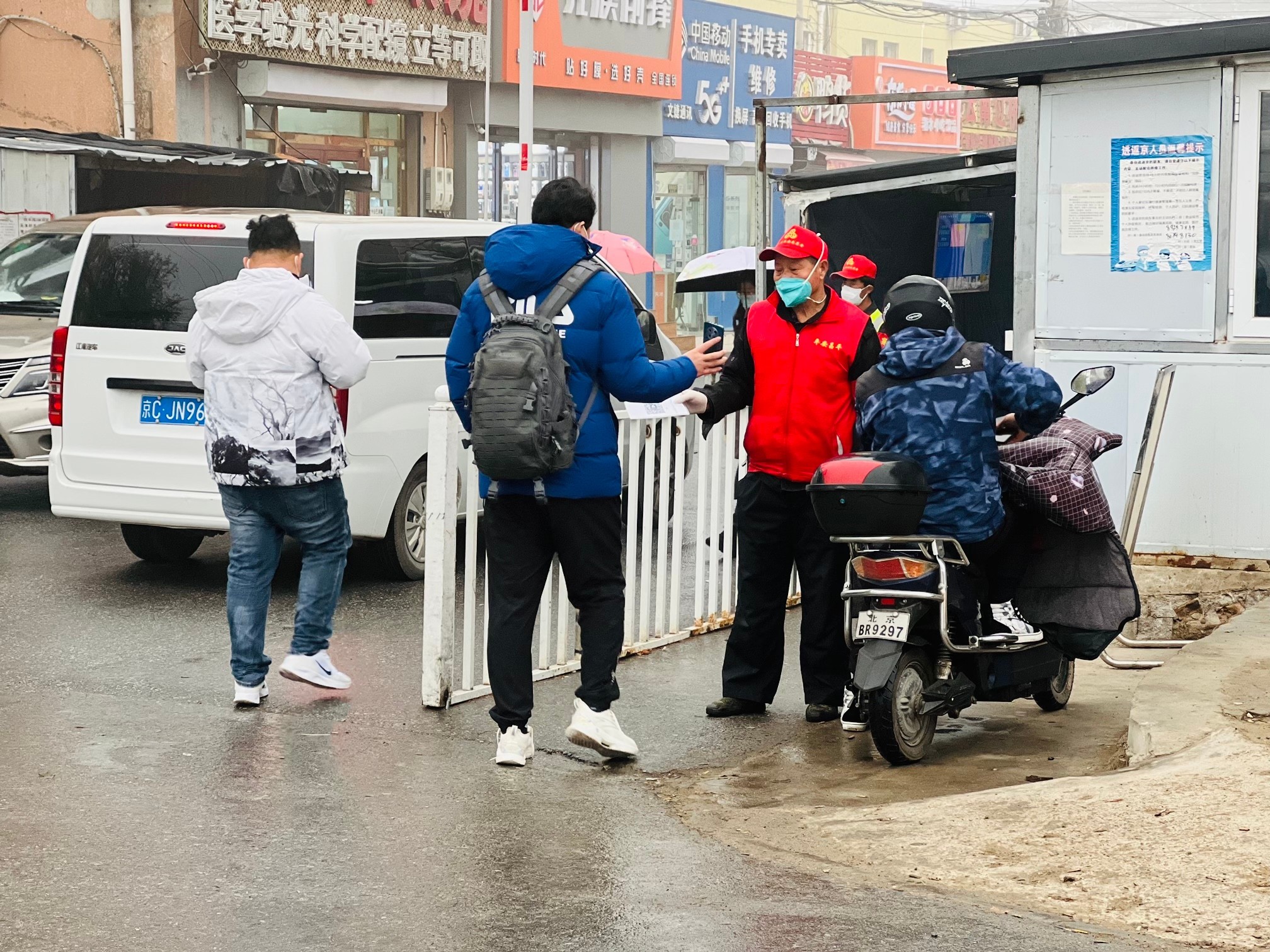 上午天空飘起了小雨,在北七家镇东沙各庄村口,工作人员和志愿者们依然坚守在卡口值守的岗位上。测温、扫码、登记、查证……他们严格落实各项防疫措施,坚持做到“不漏一车、不漏一人、不漏一岗”,担当守护居民群众健康安全的“护卫者”。志愿者刘向东说,“每天进出村的人员、车辆都很多,所以卡口值守的责任重大。虽然天气很冷,但是能够为防疫尽一份微薄的力量,我们这颗心就一直是暖的。”