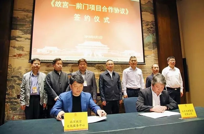昨天,北京故宫文化服务中心与北京天街集团有限公司《故宫-前门项目合作协议》签约仪式在故宫博物院建福宫花园举行。东城区国有企业天街集团与北京故宫文化服务中心将共同出资,组建两家主体公司,在前门地区开展运营。