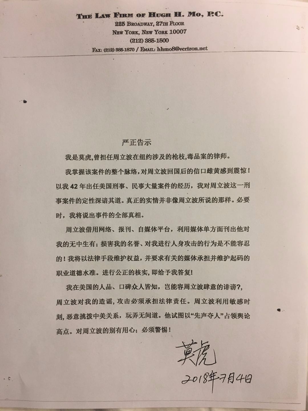 今年7月5日,莫虎曾向中新网发声明表示对周立波“回国后的信口雌黄感到震惊!”他在声明中说自己掌握周在美涉枪支、毒品案件的整个脉络,对这一刑事案件的定性深谙其道。真正的实情并非像周立波所说的那样。必要时,他将说出事件的全部真相。