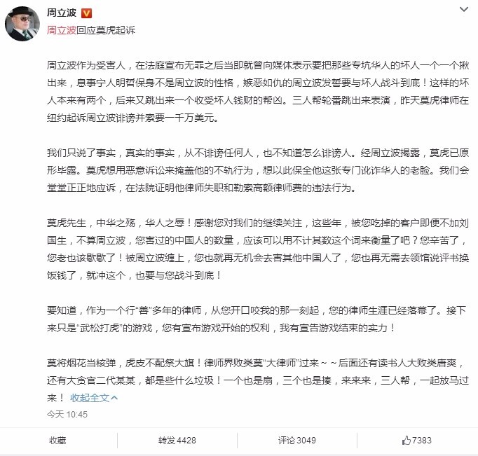对于这场即将来临的官司,周立波很有自信,他讽刺莫虎是“中华之殇,华人之辱”,同时表示一旦被周立波缠上,“您也就再无机会去害其他中国人了,您也再无需去领馆说评书换饭钱了,就冲这个,也要与您战斗到底!”