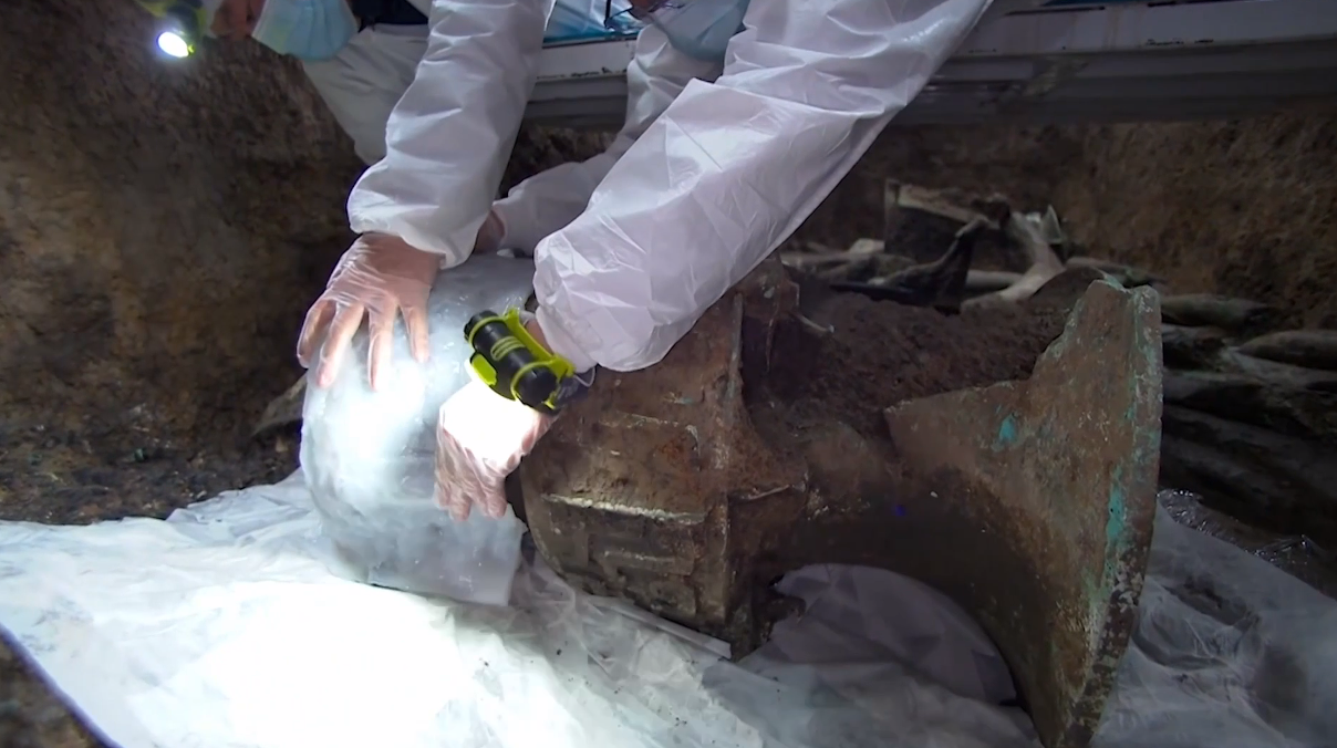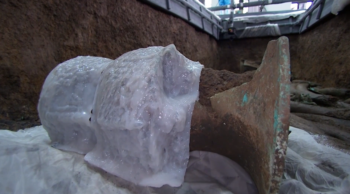 三星堆博物馆副馆长 余 健:首先要给它进行表面上三维数据的采集,同时,通过3D打印的方式制作一个模具。制作模具以后,因为本身这些器物它的器型非常大,所以它的自重也很大,在给这个文物进行提取的时候,有可能会对文物的本体会造成伤害。所以,我们就通过对这个构件,就是3D打印的这个模具上,要通过硅橡胶翻模具的方式,给它取得一个硅橡胶膜。通过硅橡胶,它可以起到一个缓冲减力的作用,可以对文物起到很好的一个保护作用。作为文物保护的团队,(我们)是第一时间就参与了三星堆新(发现)的祭祀坑出土(文物)的保护工作。