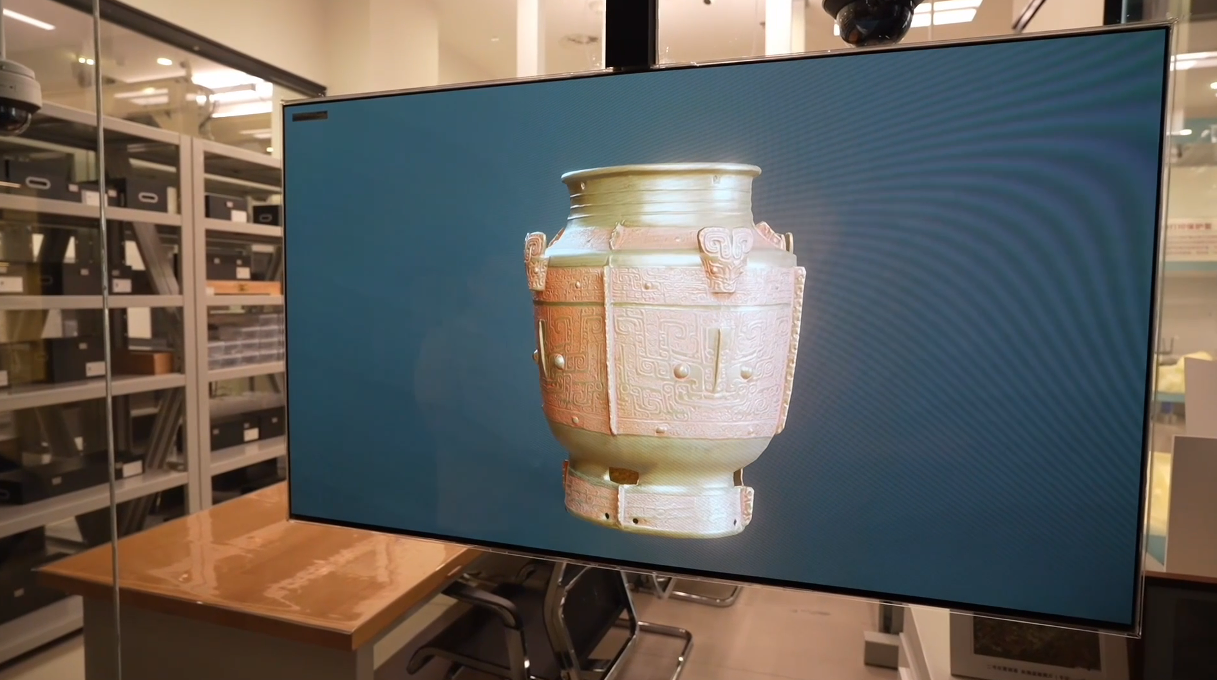 三星堆博物馆副馆长 余 健:三星堆的青铜器和玉器、金器、以及象牙,我们是有16家文保单位参与。像这一件青铜壘,可以看到它明显是带有彩绘的,其实它当时出土的时候是完全的断裂,就是变形。你可以看到我们是通过三维数据的采集,然后再通过模拟复原的方式,给它进行一个数字模拟复原。