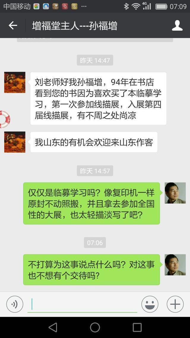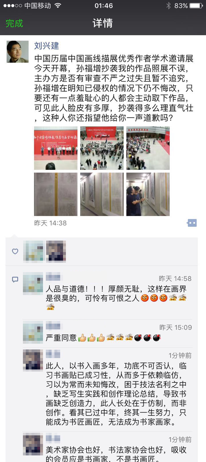 刘兴建老师说道:中国历届中国画线描展优秀作者学术邀请展今天开幕,孙福增抄袭我的作品照展不误,主办方是否有审查不严之过失且暂不追究,孙福增在明知已侵权的情况下仍不悔改,只要还有一点羞耻心的人都会主动取下作品,可见此人脸皮有多厚,抄袭得多么理直气壮,这种人你还指望他给你一声道歉吗?
