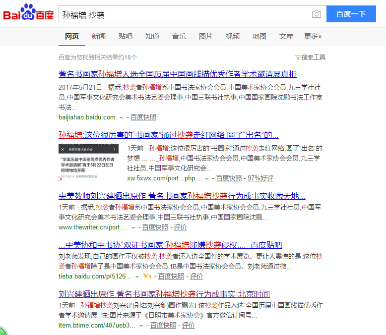 据悉,抄袭者孙福增系中国书法家协会会员,中国美术家协会会员,九三学社社员,中国军事文化研究会美术书法艺委会理事,中国三联书社执事,中国国家画院沈鹏书法工作室书法家,李翔中国画工作室画家。师从启功、魏启后、沈鹏、李翔诸位先生。先后毕业无锡艺专.北京师范大学首届书法硕士研生,进修中国国家画院沈鹏书法工作室课题班、首都师范大学李翔中国画高研班。