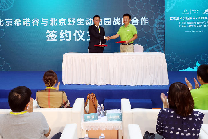 在发布会上,北京希诺谷生物科技有限公司与北京野生动物园举办了战略签约仪式。双方就保护生物多样性方面达成战略合作,将充分运用双方优势资源,展开关于中国珍稀、濒危野生动物基因种子保存、野生动物个体识别、野生动物保护和种群研究、克隆技术应用和科普知识讲座等方面的深度合作,助力珍稀、濒危动物更有效的繁育。