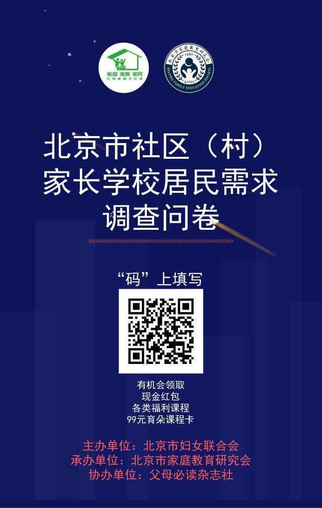 北京市社区(村)家长学校居民需求调查问卷诚邀广大家庭参与调查社区家长学校建设的蓝图由我们共同定义和描绘“码”上填写问卷问卷中涉及的问题没有正确答案请您按照自己的实际情况和真实想法回答非常感谢您的参与福利领取填写问卷即有机会赢取育朵99...
