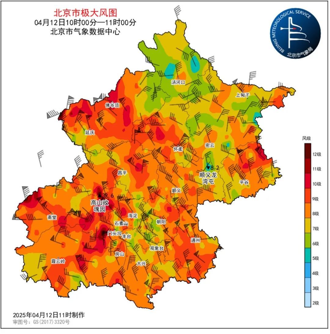 最近1小时(12日11-12时)我市部分地区阵风9~11级,山区局地14级。全市有157个测站极大风达9级以上(占比33.0%),64个测站极大风达10级以上(占比11.0%)。10级以上的站出现在海淀、朝阳、丰台、通州、房山、昌平、怀柔、平谷、门头沟、延庆、顺义。全市最大阵风风速:高山站门头沟高山玫瑰园42.2米/秒(14级);浅山区海淀北安河36.2米/秒(12级);平原地区顺义新国展29.0米/秒(11级)。