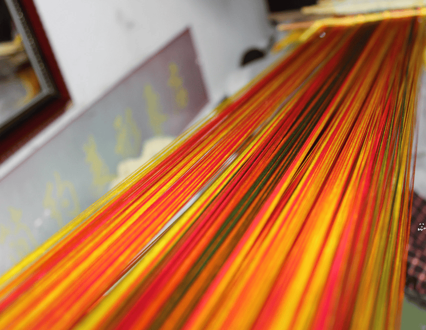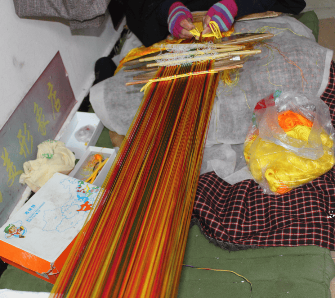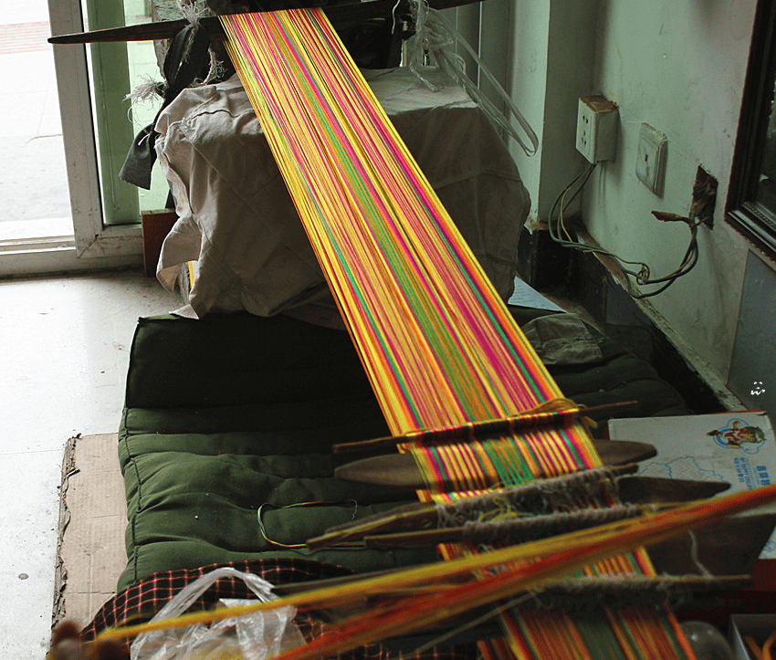 接着便是给羊毛线染色,红绿蓝染料多是在商贩处购买,但黄色染料均为自制,取得山里一种名叫“削黄连根”的植物,剥取黄色细皮与羊毛线同煮,就可以染上鲜艳的黄色,而且经久不褪。