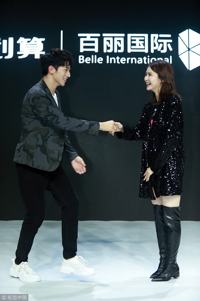许魏洲穿休闲西装简单清爽,在与戚薇握手时害羞甜笑。