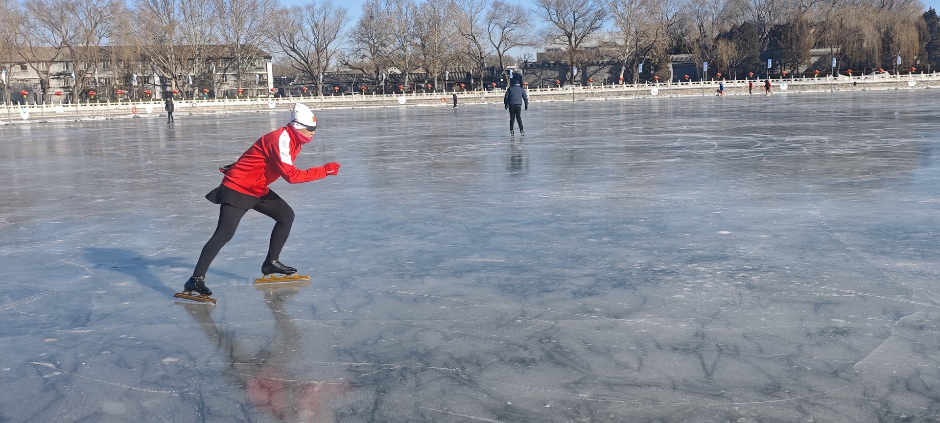 “四九”寒天,和朋友们一起来什刹海滑冰是很多爱好者多年的习惯。后海冰场开门头一天,爱好者周先生就和几个哥们来“尝鲜”了。穿上冰刀,几位你来我往,在速滑区一趟又一趟穿梭,开阔平整的冰面为畅快滑行提供充足空间,让运动爱好者尽享风驰电掣的乐趣。