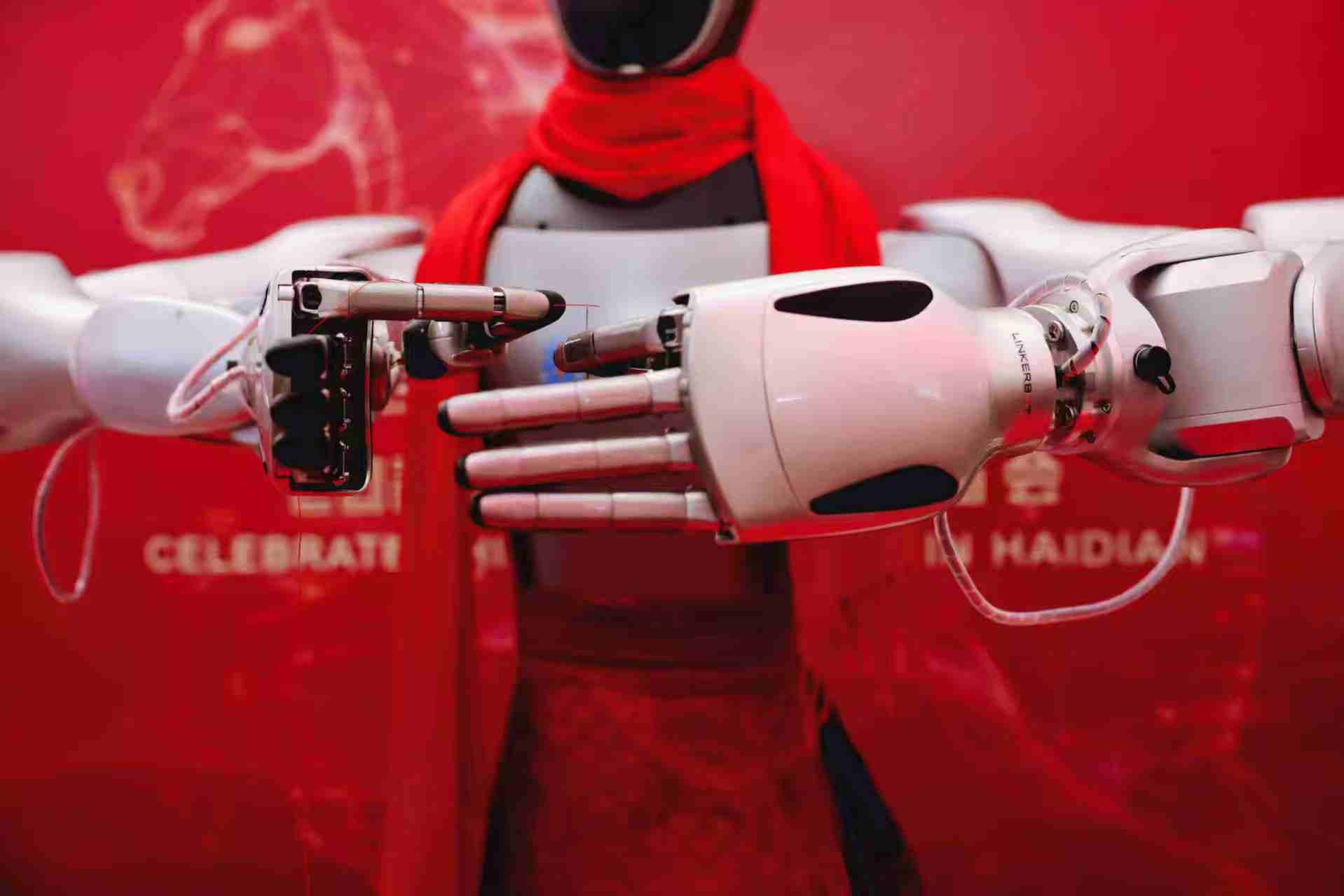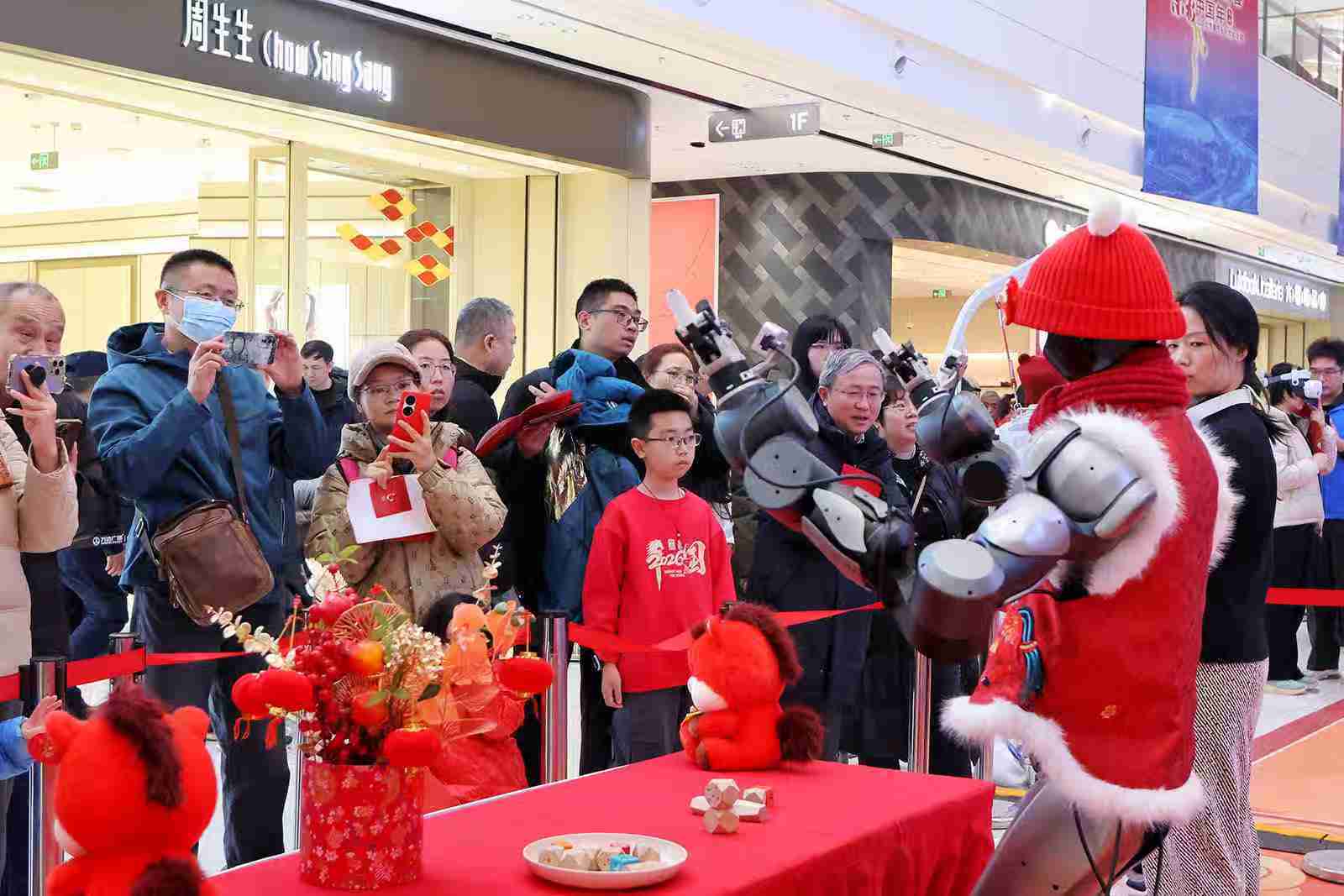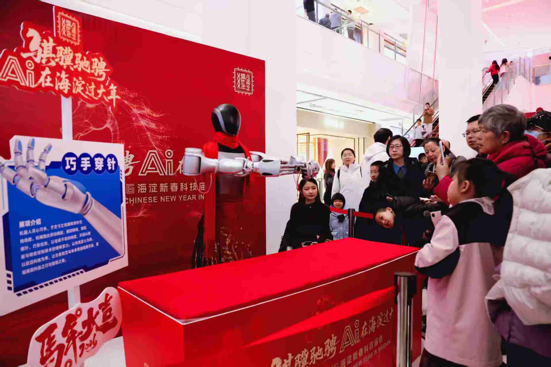 在海淀新春科技庙会(五棵松万达广场),机器人穿着传统服饰叠积木,红围巾和马甲特别喜庆,围观的大人小孩都看入迷了。科技和民俗的碰撞,马年春节的新玩法。