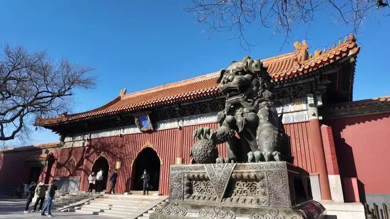 穿过昭泰门,步入雍和门殿,缭绕的烟气从殿前香炉里漫出,让原本硬朗的宫殿轮廓添了几分朦胧。殿前那对昂首而立的铜狮,左狮踩球象征权力、右狮抚摸幼子寓意传承,往来的人潮在铜狮旁缓缓流动。历史爱好者杨征介绍: