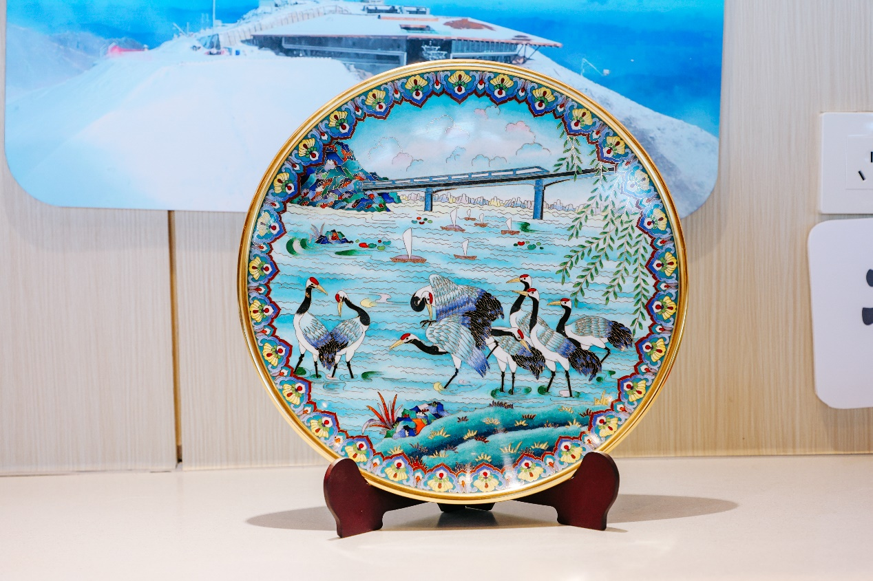此外,一批非遗项目和传承人向国家高山滑雪中心捐赠了非遗作品。景泰蓝制作技艺捐赠的《和谐颂赏盘》巧妙融合传统瑞鹤意向与现代高铁元素,展现自然与时代共生之美;同时,同仁堂针灸铜人、兴寿灯笼、一得阁春联、北京耍货“料兽对马”、手工镀银磨花镜等非遗作品也各显匠心,共同传递出深厚的文化意蕴。