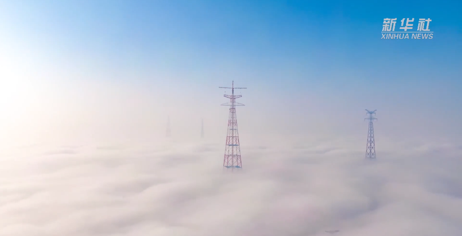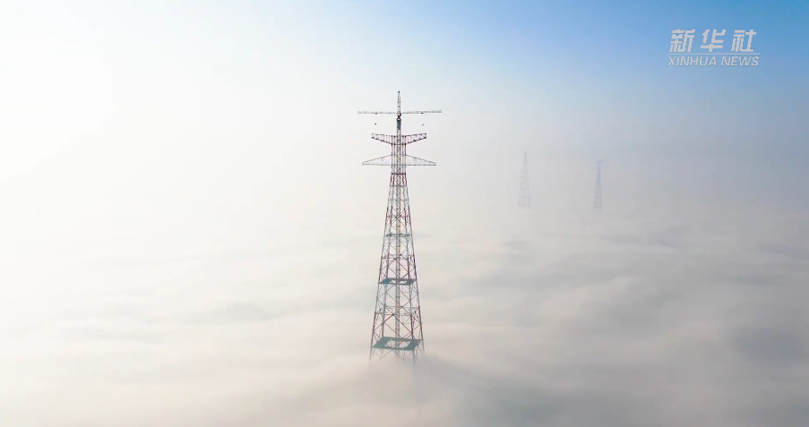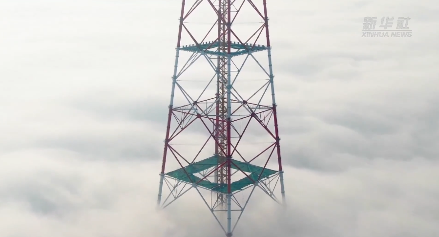冬雾缭绕,电力工人在高385米的现今世界最高输电铁塔塔顶作业。无人机视角带你拨开浓雾,俯瞰最壮丽的景色,仰视最美的劳动者。