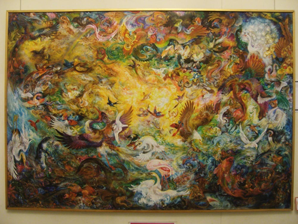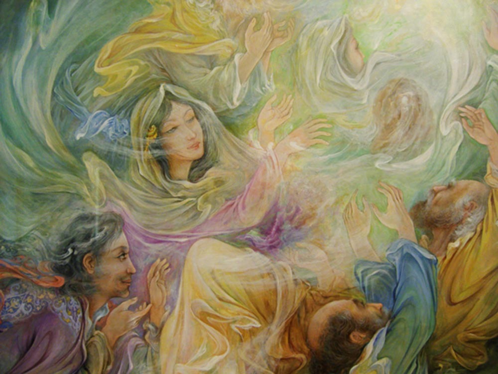 画面中人物神态各异,刻画极其细致,甚至人物的发丝都清晰可数。仙乐飘飘,流光溢彩,如天国之景