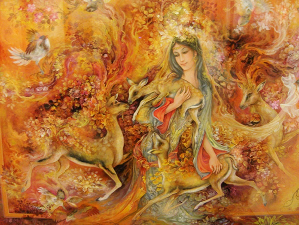 一片金黄的深秋树林中,小鹿与其保护神在一起。