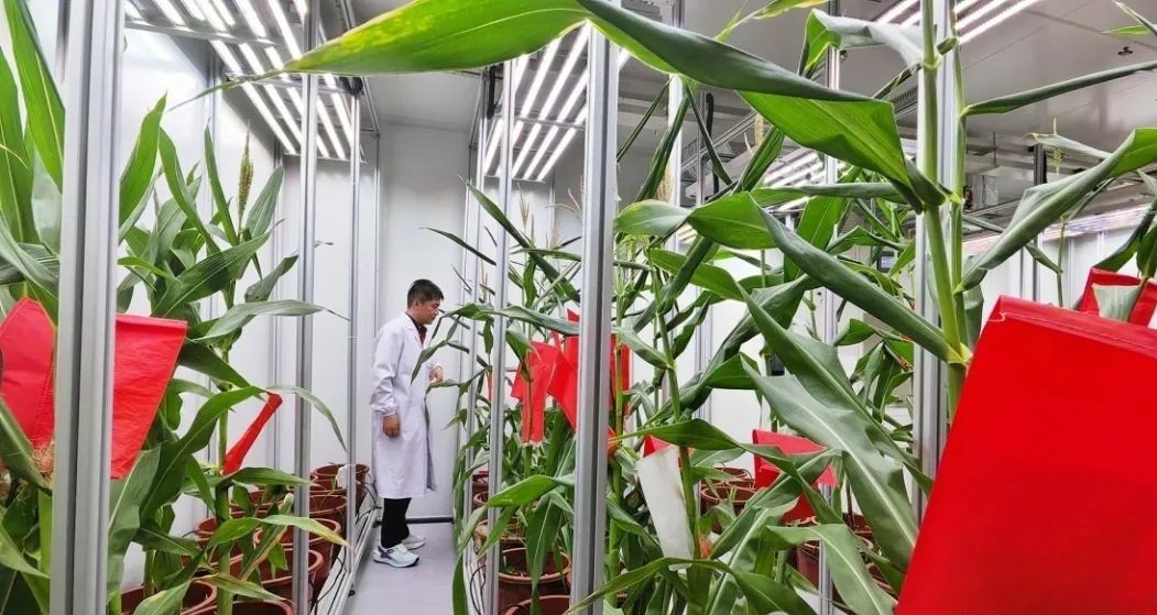 在玉米生长室里,玉米秆上挂满了饱满的玉米穗,“目前我们培育的玉米已经完成授粉,两周后就可以通过胚挽救的方式,进入下一代了。”北京农林科学院玉米研究所分子检测中心主任王凤格介绍,进入加速器后,玉米从播种到取胚,整个生长季只需要70天左右。按照一周年时间来计算的话,玉米在加速器里一年可实现五代育种,如果不通过加速器,在北方,玉米只能育一代,即使到海南南繁,一年也只实现两代。