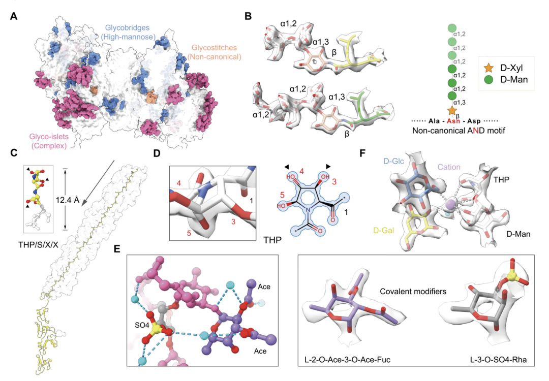 图1. 高分辨率冷冻电镜解析揭示管状纤绒毛中结构N-和O-糖质