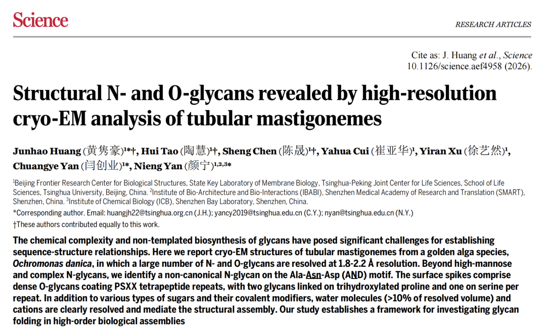 深圳医学科学院颜宁团队联合清华大学团队,在《科学》发表糖质结构研究重磅成果。团队搭建高分辨率冷冻电镜、糖蛋白质组学与AI建模融合研究体系,获得约2Å整体分辨率、核心局部1.8Å的超高分辨率三维电镜密度图,将天然糖质复合物研究推进至近原子分辨率层面。