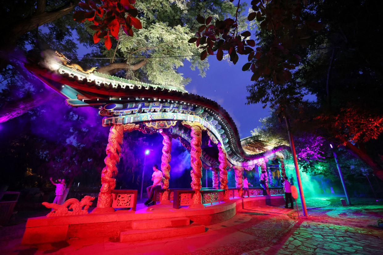 龙潭公园的夏夜被一场异彩纷呈的光影秀点亮,为大家带来酷炫的视觉盛宴。光影秀每日18:30至22:00在龙潭公园西北区域点亮,将举办至10月6日。大家可通过美团、抖音平台购买电子票,也可在公园北门、西北门现场购票后入场。这个夏夜,不可错过的夜游新体验——来龙潭公园感受光和影的魅力吧!