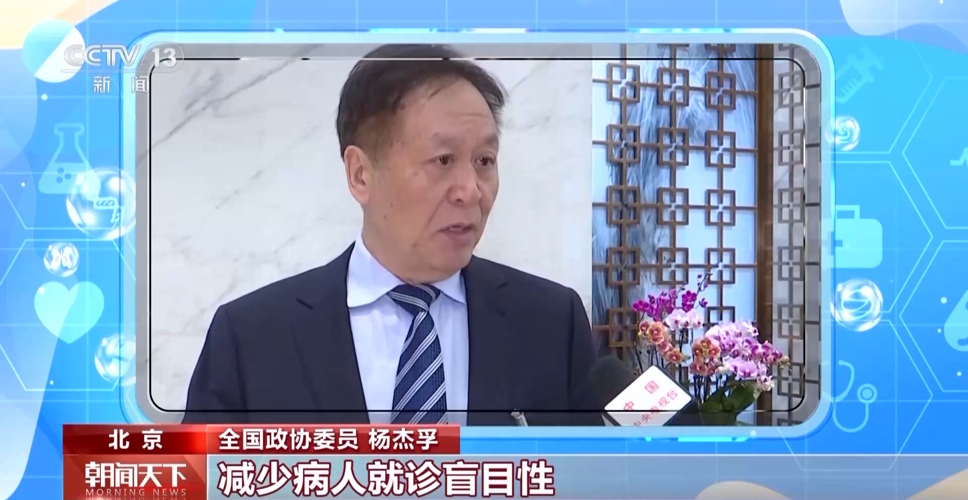 全国政协委员 杨杰孚:首先在院前甚至院内应该辅导病人的诊疗,因为病人很多不知道看谁看哪个科,我们通过人工智能简单询问,尤其是把电子病历开了,我们的智慧医疗辅导病人看科室看专家,减少病人就诊盲目性。