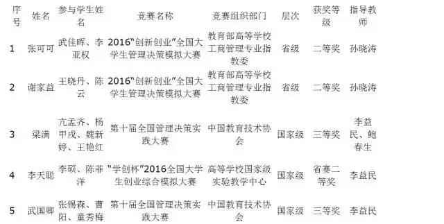 教学成果学科竞赛获奖2009,挑战杯,许远恒等,国家级三等奖2011,金蝶杯沙盘模拟企业经营大赛,张雪飞等,省级一等奖2012,用友杯企业经营模拟大赛,白雪等,省级三等奖2012,大学生创业计划大赛,张亚楠,省银奖2012,全国大学生...
