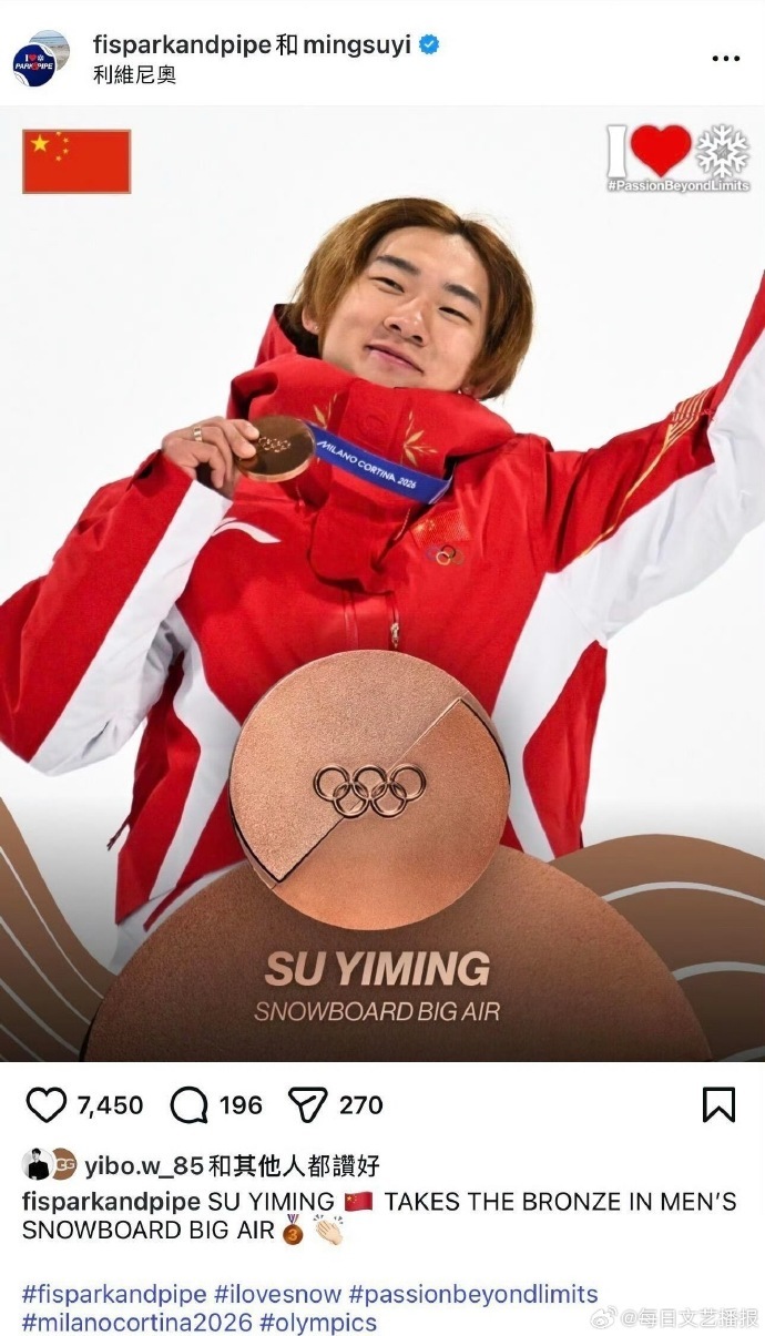 苏翊鸣凌晨在米兰冬奥会获得了单板滑雪男子大跳台铜牌,王一博第一时间就在ins点赞小苏啦!优秀的人互相吸引呢,祝贺小苏[爱慕][爱慕] ...