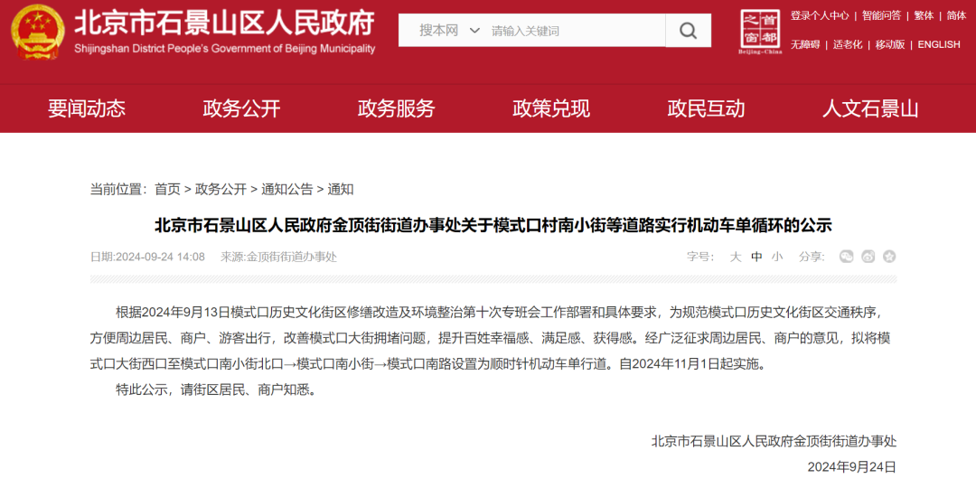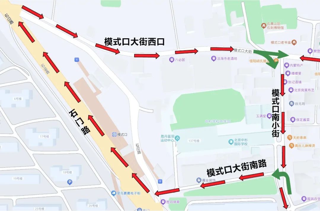 11月1日起,模式口大街西口至模式口南小街北口——模式口南小街——模式口南路将设置为顺时针机动车单行道。