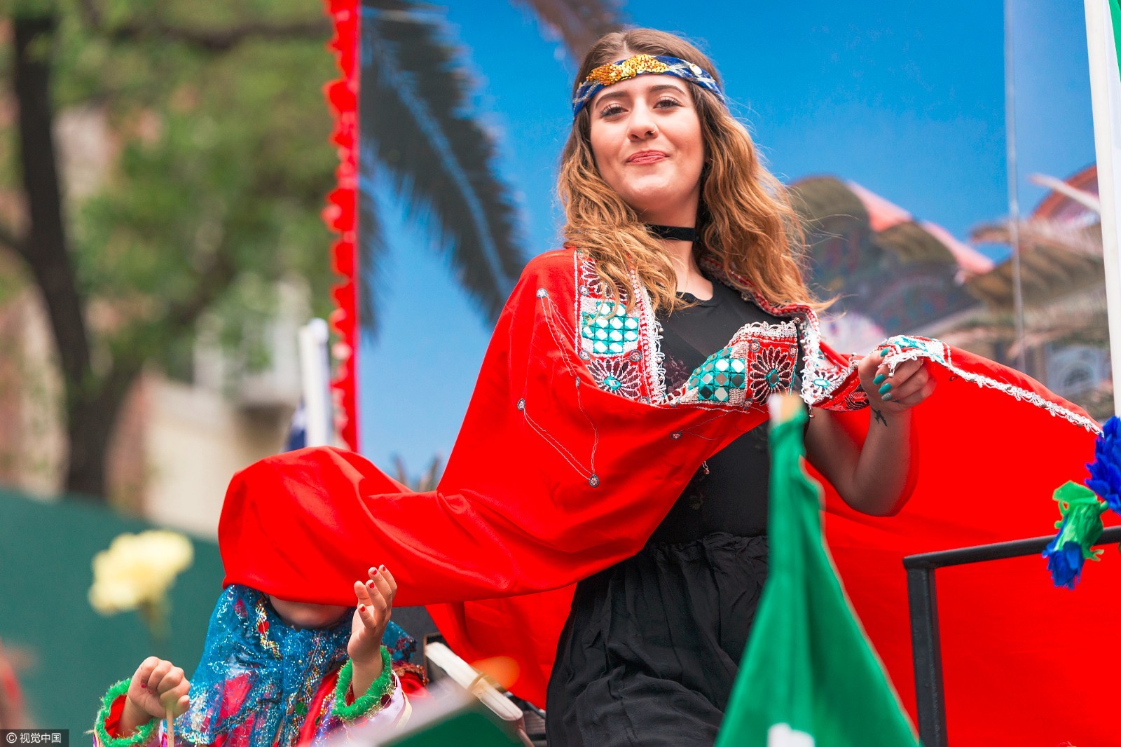 游行中,身着红衣的姑娘宛若仙女。