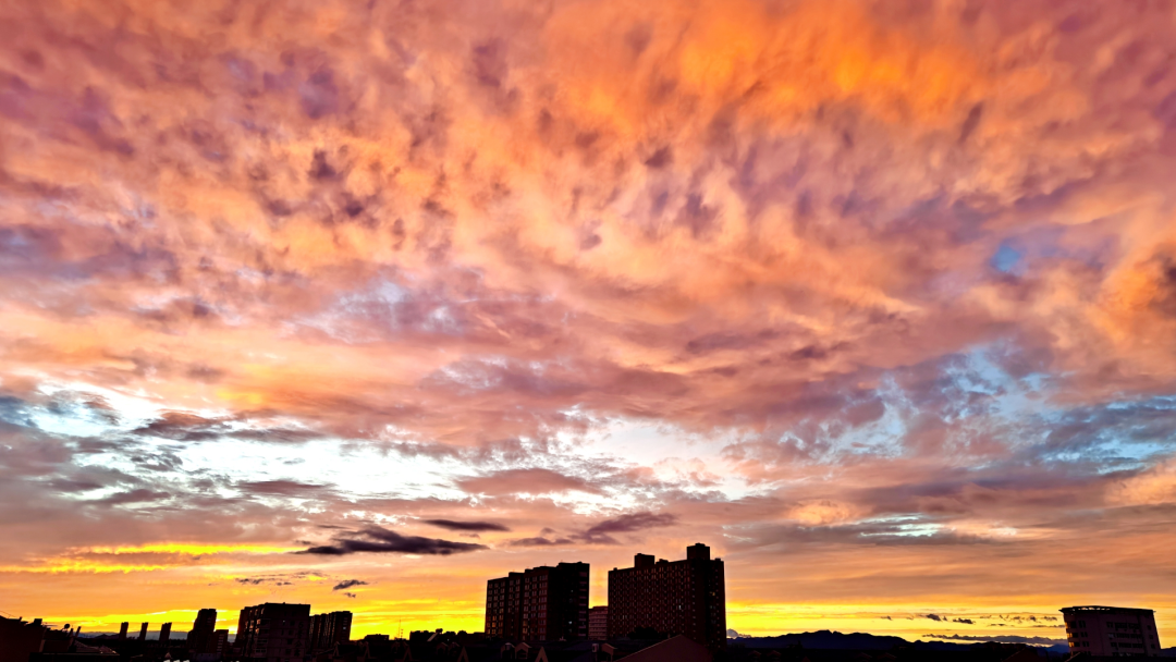 为何雨后晚霞更绚烂壮观?傍晚夕阳中的红色、橙色等光线穿过大气层,照射到不同高度的云层形成绚丽的晚霞。雨后大气层中空气湿度大,云层、云状千姿百态,云中的水滴对光线的散射作用使得晚霞色彩和形态更加丰富,大范围的透光云层也让晚霞更加绚烂壮观。