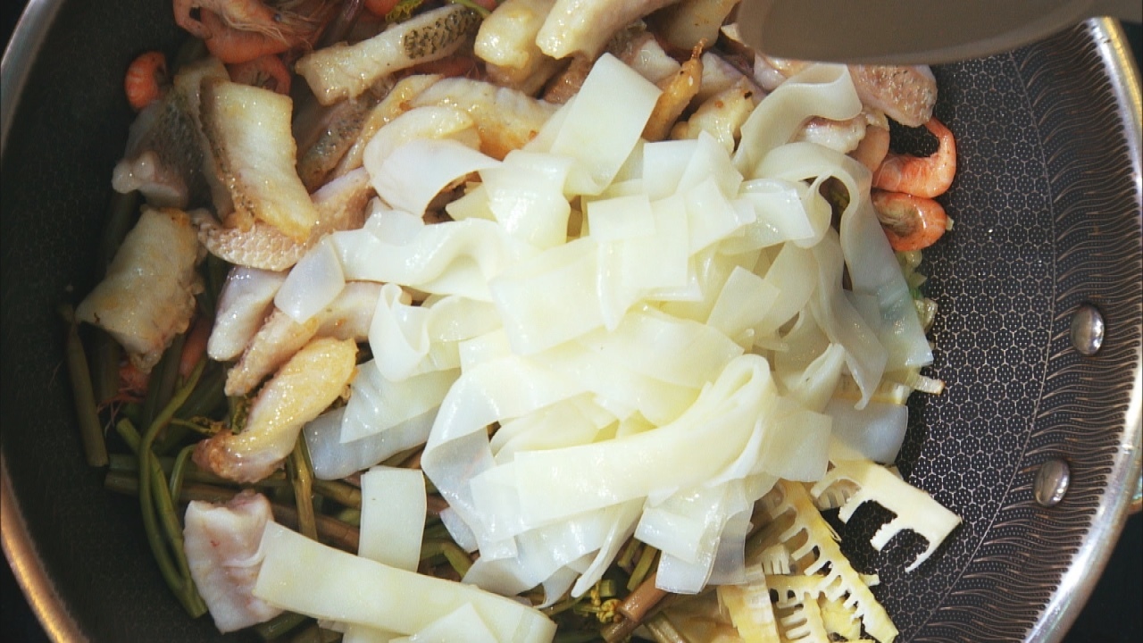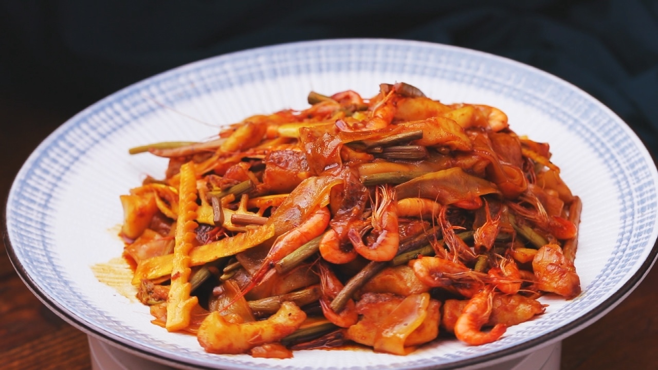 步骤3:起锅烧油,下入焯水后的蕨菜、笋还有鱼虾,放上凉皮,洒入料汁,翻炒九秒即可出锅。