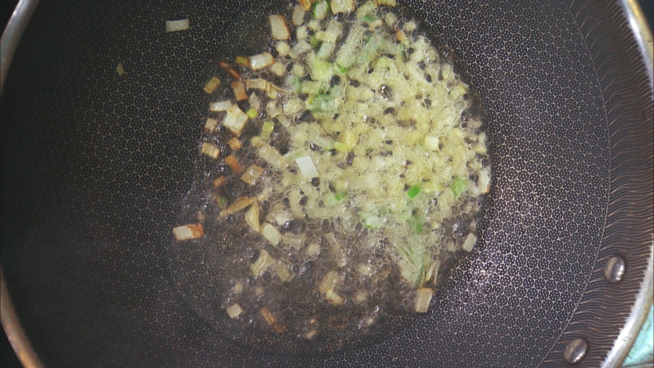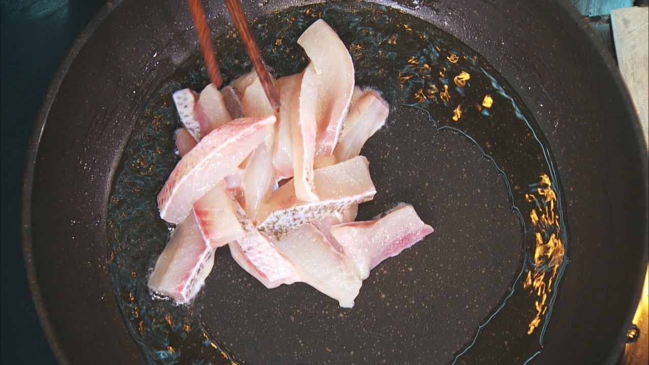 步骤1:浆过的鲈鱼条下锅煎熟,河虾焯水备用;
