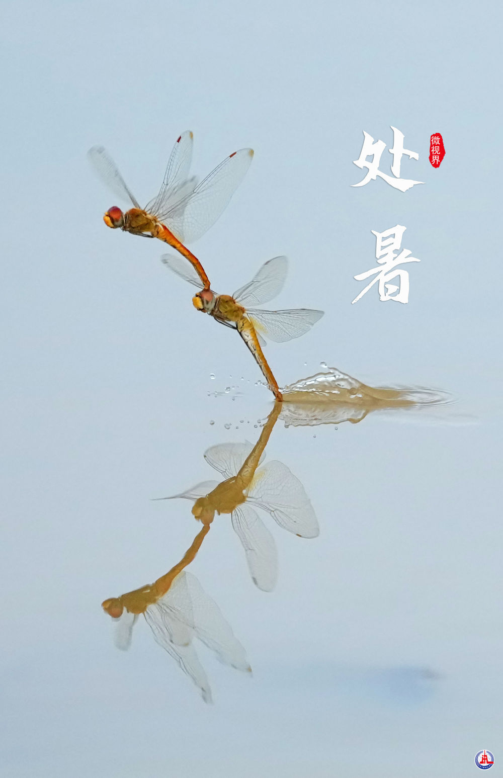 ↑广西南宁市邕宁区蒲庙镇,蜻蜓在水塘点水。 新华社发(马华斌 摄)
