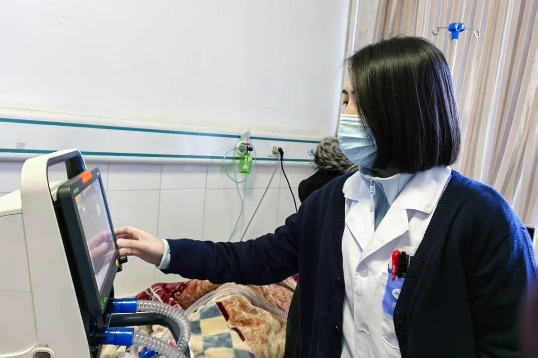 北京中医医院顺义医院医生李霞在科左中旗人民医院精准调节呼吸衰竭危重患者呼吸机各项参数。