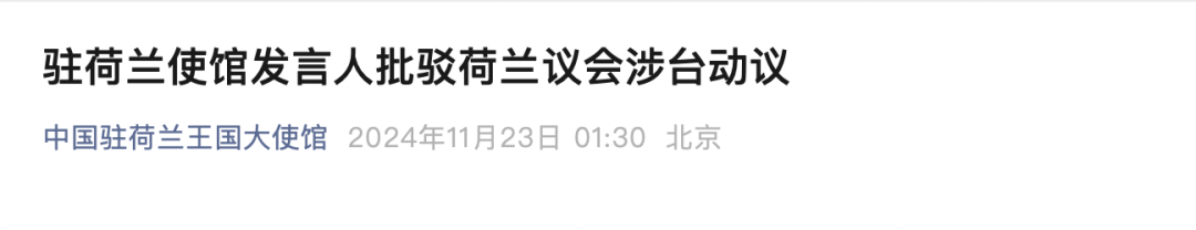 近日,荷兰议会二院再次通过涉台动议,涉及经贸等领域。我馆发言人评论如下: