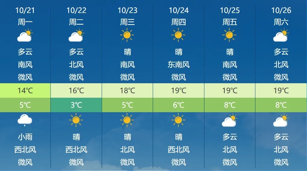 根据气象部门预报,下周大部分时间天气以晴为主,21日夜间有小雨。白天最高气温14~19℃,夜间最低气温8~3℃,昼夜温差进一步加大,请关注临近天气预报,及时调整着装。