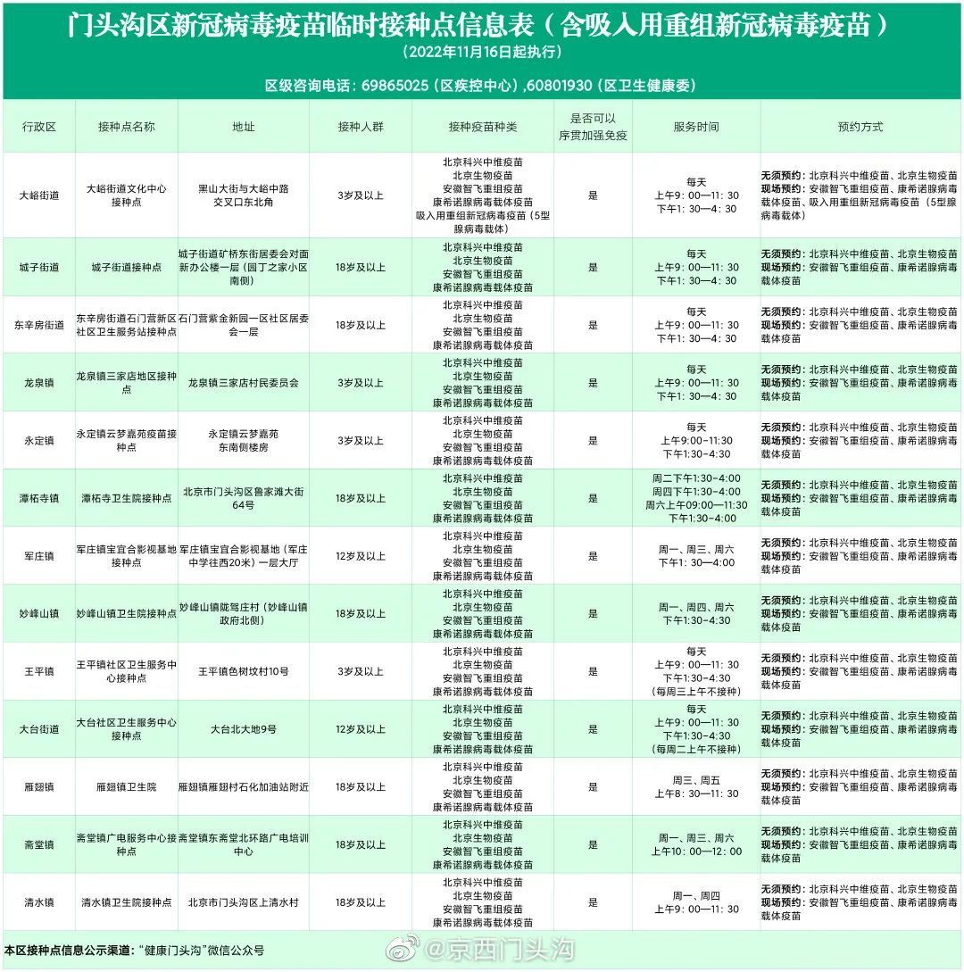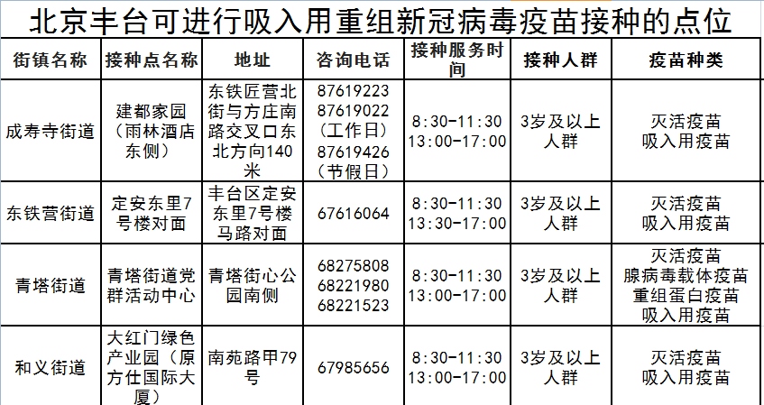 11月14日,丰台区卫健委发布消息称,丰台区目前可进行吸入用重组新冠病毒疫苗接种的点位有成寿寺街道、东铁匠营街道、青塔街道、和义街道。