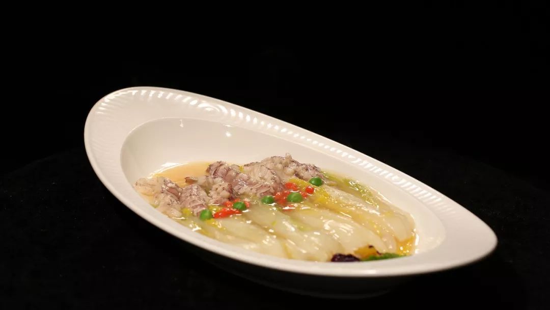- 3 -烧制:将白菜和去壳的皮皮虾放入鸡汤锅内烧煮,放入适量糖、姜汁,烧煮2分钟出锅。