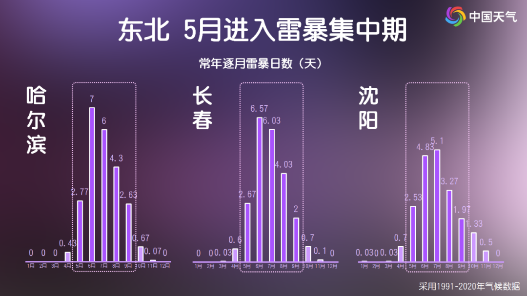 从历史数据来看,5月开始,东北、华北及黄淮等地开始进入雷暴集中期,雷暴日数较之前明显提升。