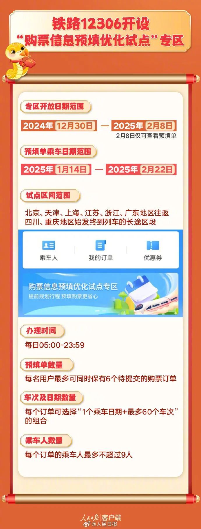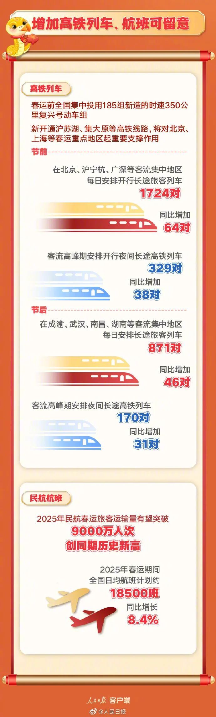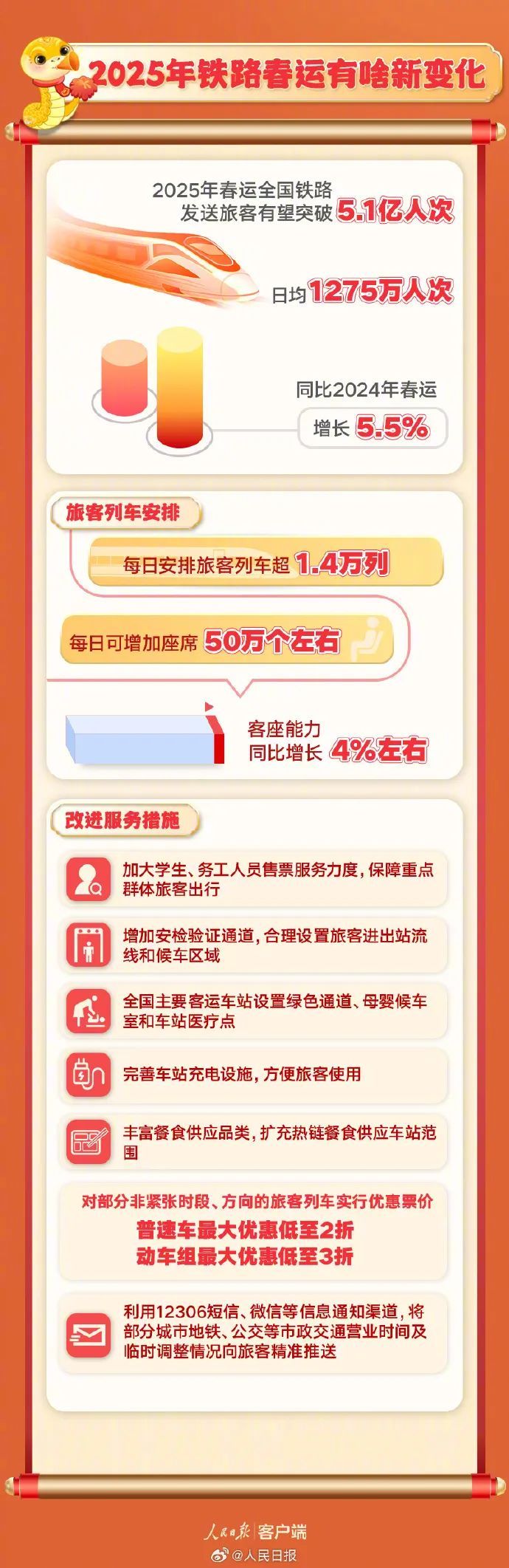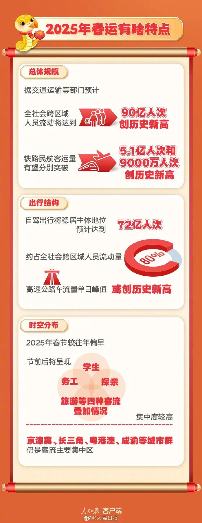 2025年春运从1月14日开始到2月22日结束,为期40天。据介绍,跨区域人员流动将达到90亿人次。今年春运有啥特点?铁路春运有什么新变化?春运期间天气如何?春运火车售票关键时间节点提前了解↓↓祝您出行顺利!