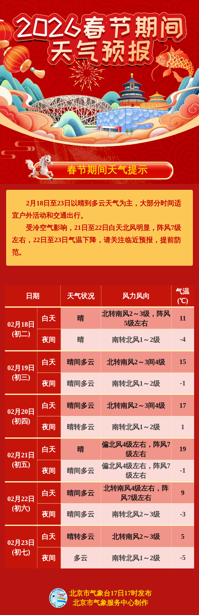 大年初五(21日)开始,受新一波冷空气的影响,北京将再次迎来大风降温天气,其中,大年初五北风明显,阵风7级左右,大家外出时要注意防风防寒,同时远离广告牌等临时搭建物,谨防高空坠物,确保出行安全。大年初六到初七气温将明显下降,建议大家及时关注临近的预报预警信息,根据天气变化合理调整着装和返程计划。