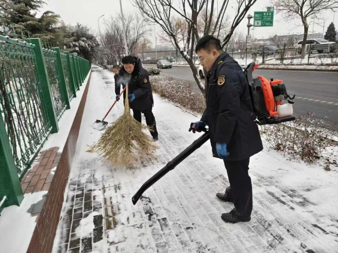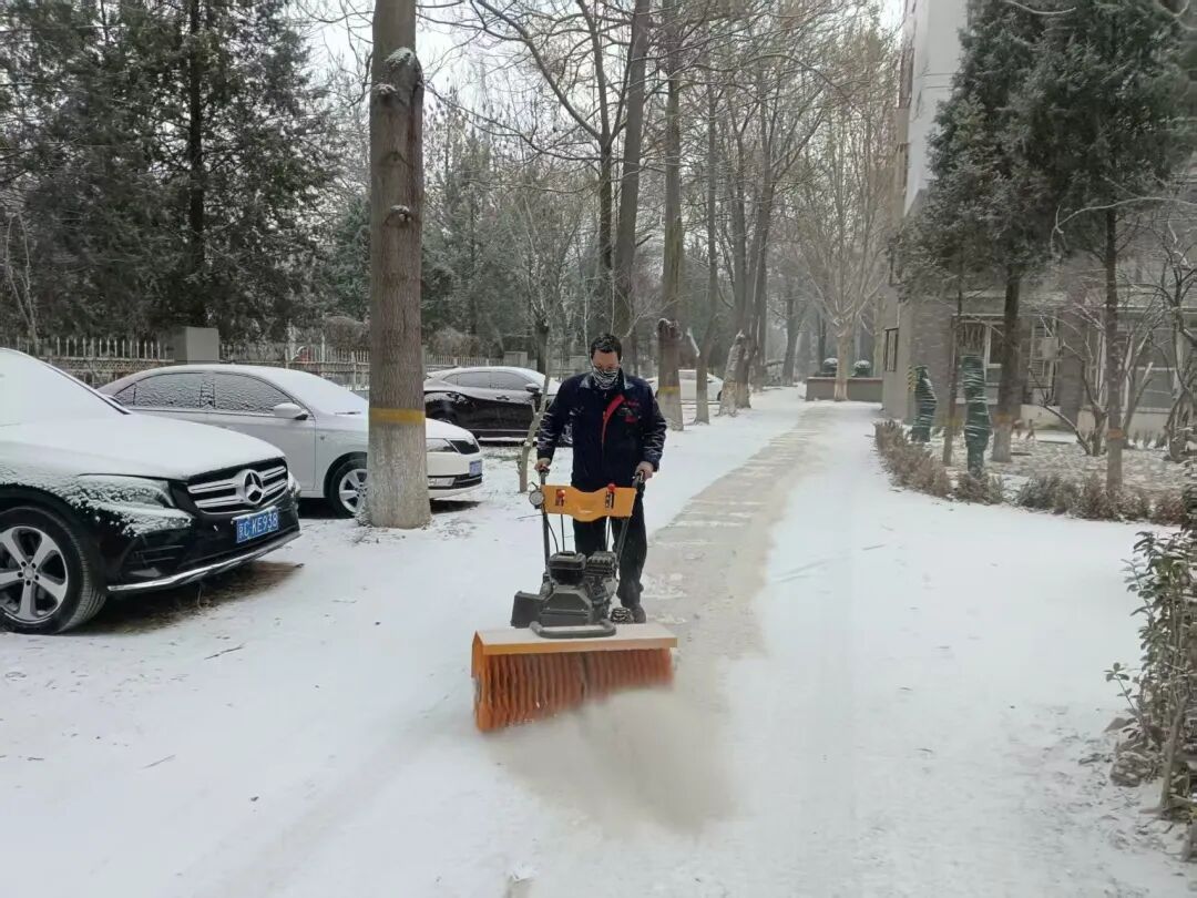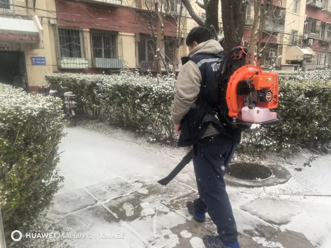 在寒冷的天气中,大家团结协作、干劲十足,按照 “先打开一条通道,再向两侧扩展” 的作业流程投入清雪工作。他们有人奋力挥动铁锹、扫帚,将积雪推到路边;有人熟练操作着除雪车、背负式风力清扫机等专业设备,将主干道上的厚重积雪快速推除、聚拢,切实用实际行动为居民开拓出一条条“安全通道”。