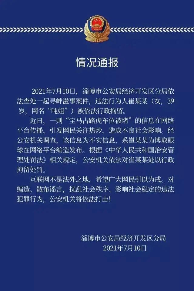 车位被宝马霸占?网民“吨姐”胡编乱造被行政拘留要知道,网络不是任由某些人胡说八道、胡作非为的地方。编造传播虚假信息的人,必将自食其果。咱们再举一个例子,去年7月,发生在山东淄博的“宝马占路虎车位被堵”事件,一度引发舆论关注。怎么回事儿呢?一名网名为“吨姐”的网友发文称,自家车位被一辆宝马车霸占了158天,并称宝马车主叫来叉车,要把自己的路虎车给叉走。为了反击,“吨姐”在车里放了价值145万的花瓶,并在车上贴了声明:“车内有贵重物品,擅自挪动,后果自负”。两位车主互不相让,最后甚至“闹上法庭”。在短视频平台上,“吨姐”对此事几乎是每天一更新,她的账号在短短几个月里暴涨70多万粉丝。
