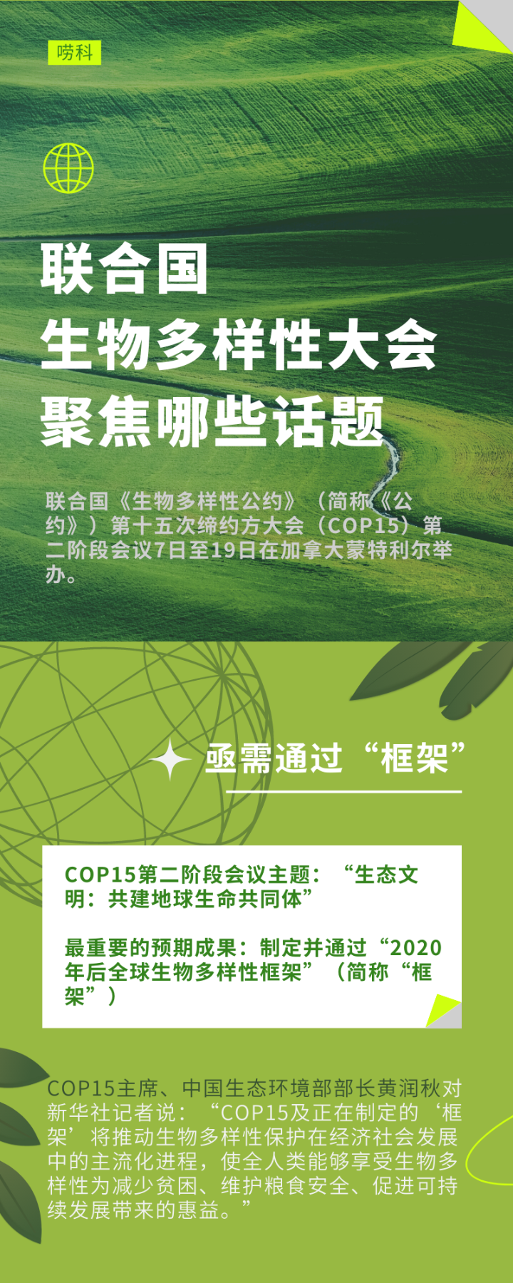 当地时间7日,联合国《生物多样性公约》第十五次缔约方大会第二阶段会议在加拿大蒙特利尔正式开幕,简称COP15第二阶段会议。在此次会议中,将签署“2020年后全球生物多样性框架”。 框架围绕《生物多样性公约》的主要目标进行制定,除了提出2030年阶段性目标和2050年长期目标之外,还有20多项小的行动目标,涵盖生态系统保护、土地利用、减少污染、控制外来物种入侵等与生物多样性最密切的因素。